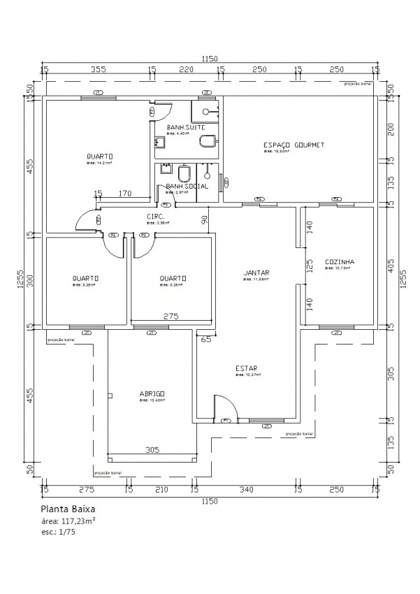 3 quartos, suíte, banheiro social, sala de estar/jantar, cozinha, espaço gourmet e garagem.